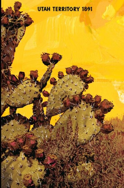 The art is very reminiscent of Blueberry by Mobius (a decades-long French series, it is worth nothing, not an American comic), or JH Williams III’s work in the mesa scenes on 2005’s Seven Soldiers of Victory: a serious of gritty line drawings by Dan Panosian which suits the harsh terrain much better than photo-realism. The art is a pleasure to contemplate, especially a full-page rendition of flowering cactii, apparently drawn by Mr Panosian simply as a demonstration of artistic prowess. Yellow hues are the predominate palette of the comic, which was perhaps inevitable, but clever regardless. As the plot gathers speeds, the colours ominously move down the spectrum, to crimson and scarlet.
