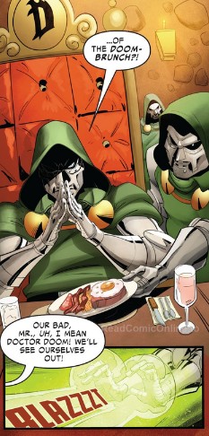 - The Doctor Doom brunch interruption, arguably the funniest concept within the title (who would have thought that Dr Doom prefers brunch to the degree that it has its own nomenclature?), is over almost immediately.