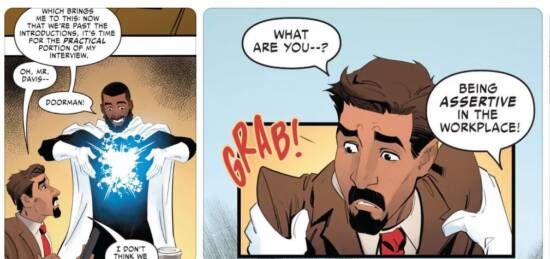 Doorman tries to sell himself not just as a regular applicant, but as a superhero with unique abilities. The problem is that even in-universe, he is not exactly held in high regard, and the interviewer remains unimpressed.
