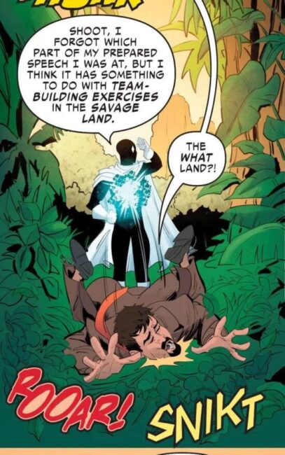Things spiral when DeMarr decides to demonstrate his powers. Instead of impressing his interviewer, he repeatedly places him in dangerous situations across the Marvel Universe: in the middle of a fight between Spider-Man and Scorpion, in the Savage Land during a clash involving Wolverine and a dinosaur, and most disastrously, in Latveria right in front of Doctor Doom during brunch. Predictably, the interviewer is terrified rather than impressed, and DeMarr’s attempt at landing a job collapses.