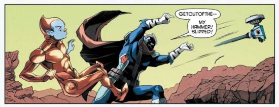 This pattern repeats throughout the issue, culminating in the expected marquee clash between Lion-O and SilverHawks’ leader Quicksilver. Of course, the fight ends in a draw because one champion cannot be better than the other without upsetting fans, and just as predictably, it is interrupted before any meaningful resolution.