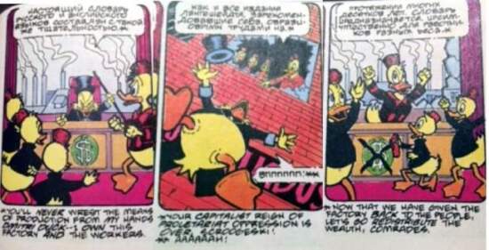 Perhaps also after “The Air Pirates” debacle Disney does not want to know. In the tenth issue of Howard Chaykin’s “Amerikan Flagg!” (1989, First Comics), Donald Duck and friends are depicted hurling Scrooge McDuck to his death in a Soviet putsch: