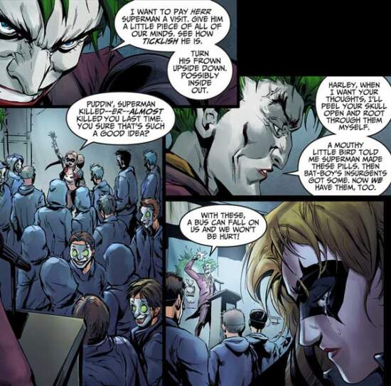One notable takeaway from the series is that it doesn’t overly romanticize Harley Quinn’s relationship with the Joker, a voguish and distasteful evolution given The Joker is a serial killer and occasional torturer. In “Injustice: Ground Zero”, The Joker’s absence (after being murdered by Superman) had a positive effect on Harley Quinn. The character took over the villain’s surviving henchmen and transformed these street thugs and criminals into revolutionary freedom fighters. The henchmen themselves are written to consider that their lives have undergone a massive improvement and resisted the idea of a returning Joker leading them again (unbeknownst to the henchmen, this version of the Joker is the character from DC Comics’ mainstream continuity, having crossed over as part of “Injustice: Gods Among Us”’ main plot. These sorts of exercises are designed to increase sales but have the collateral detriment of sowing utter confusion amongst new readers). The sentiment is shared by Harley Quinn’s only real friend, Poison Ivy (another villain from the continuity of Batman), who refuses to join any side of the war, but helped Harley Quinn after finding out that Harley has plans to finally get rid of The Joker.