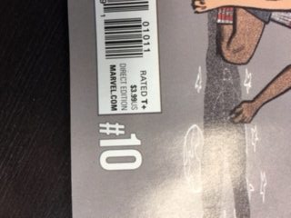 And so this is a new tactic from Marvel Comics: misleading readers into thinking that this tenth issue is actually the first issue of the series. The addition of the actual image number, in grey on white and blended into the publisher’s bar code box located at the base of the cover, does not militate against confusion: