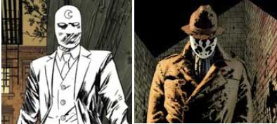 In any event, the series is about a masked vigilante named Marc Spector, who uses the moniker “Moon Knight”. The backstory of this character is something we have discussed previously. This present series is heavily invested in the exploration of Spector’s multiple personality disorder. To underscore this, forgoing the white tights and cape, Spector is now dressed very much like the mentally disturbed vigilante called “Rorschach” from the notorious and critically acclaimed title “Watchmen” (1987), written by British scribe Alan Moore. Here is a side-by-side comparison, with Moon Knight on the left, Rorschach on the right: