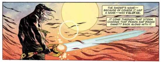 Salvation came from the most unlikely of places. Emmett appears and destroys the demon using a 12-foot enchanted sword he found in the middle of the storm. The sword had a name: Valofax, and as long as Emmett is touching it, he is rejuvenated and no longer inhibited by the diseases of his old age (though he remains an old man.)