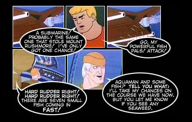 The plot of this issue involves Aquaman’s arch-enemy, Black Manta, formulating a war between Atlantis and the United States. Aquaman’s denial of aggression oddly is reminiscent of Saddam Hussein’s denial of Iraq’s involvement in 9/11. As Black Manta’s forces, using Atlantean vessels and technologies, brutally attack American cities using hit-and-run tactics, the Atlanteans and the Americans start to fire upon each other’s submarines. There is genuine geopolitical tension in the plot, a strange thing for a superhero comic book.