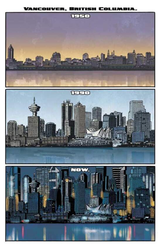 While officials push responsibility in varying directions, the first issue of “The Dregs” presents the problem simply. The opening page shows the city’s skyline as it appeared in 1950, 1990, and how it towers currently. Together, the panels suggest a city that has grown too quickly and perhaps in the wrong direction.
