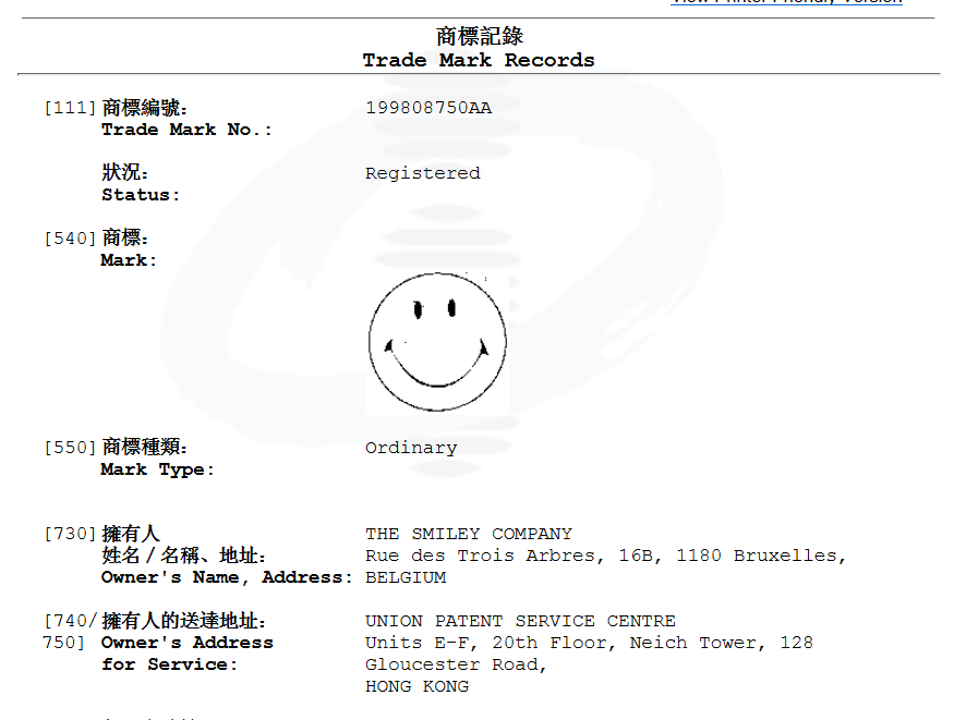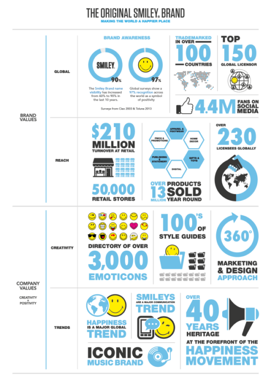 The Smiley Company SPRL is very willing to license its brand. Its website says: “The Smiley Company is today one of the TOP100 licensing Companies in the world, with over 260 licensees globally generating annual turnover at retail in excess of $265 million and selling more than 23 million products year round. The Smiley trademark is registered in over 100 countries and in more than 13 product categories and according to a recent Toluna survey has 97% recognition across the world as a symbol of positivity.”