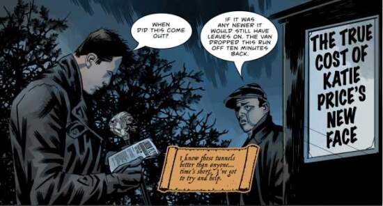 But the action that follows is entertaining enough, and the man saves the train by causing it to shunt into an emergency tunnel. The website for the comic, www.20storeysdown.com, describes the man as “Sgt Jack Tudor”, although his name is not actually revealed in this first issue. Despite the military (or police?) title, it is not yet clear why this subterranean explorer fears the police, and he covers his face when he is near them.