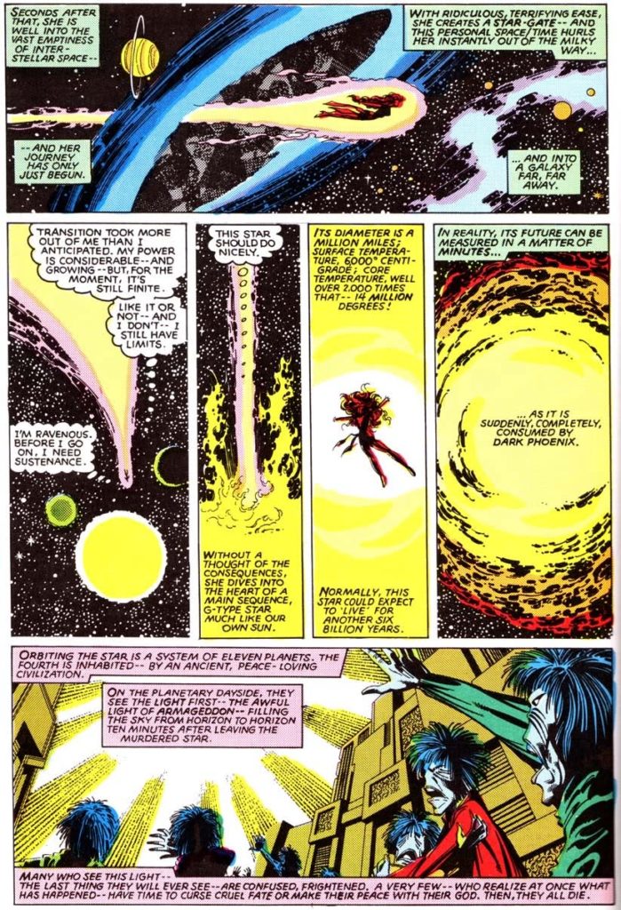 Due to the vagaries of the parallel universes which appear in Marvel Comics’ publications, there is another character called Rachel Summers (the daughter of Jean Grey from a parallel timeline) who is also called Phoenix (and more recently, “Prestige”). Both the cosmic entity and Rachel Summers exhibit astonishing abilities, including telepathy and telekinesis. In the case of the cosmic entity, these abilities include the penchant for consuming and extinguishing stars. This was first seen in Uncanny X-Men #129 (1980).