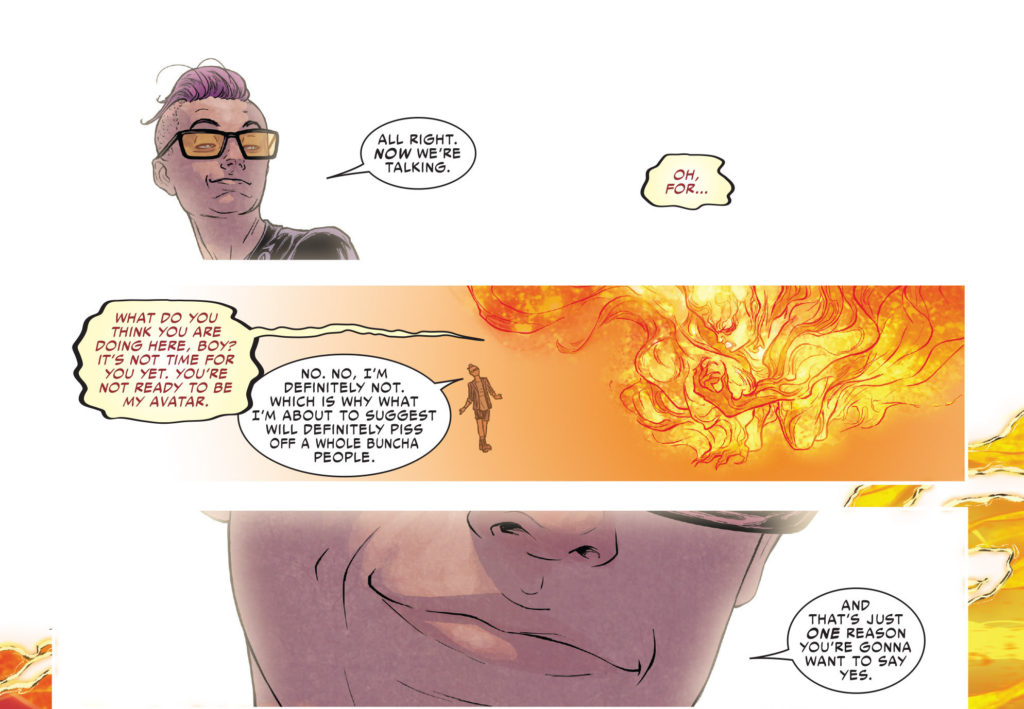 The lure for Foster is the ability to recover from her debilitating cancer. Foster sees through the ruse, and Phoenix’s interest in the scenario is ultimately through an odd compromise offered by a supporting character in the Uncanny X-Men, Quentin Quire. Quire is destined to be the Phoenix’s avatar, and their relationship is amusing.