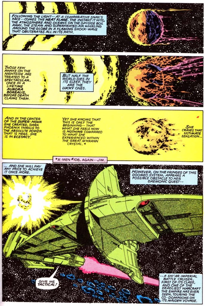 b. Second, a character which capriciously consumes stars is a very different type of threat from the usual world-conquering tyrants. Phoenix is depicted as a force of nature, in the totemic shape of a fiery bird of prey. The character appeals to the subconscious – a Satanic demon of fire. It is powerful and primal in its malevolence.