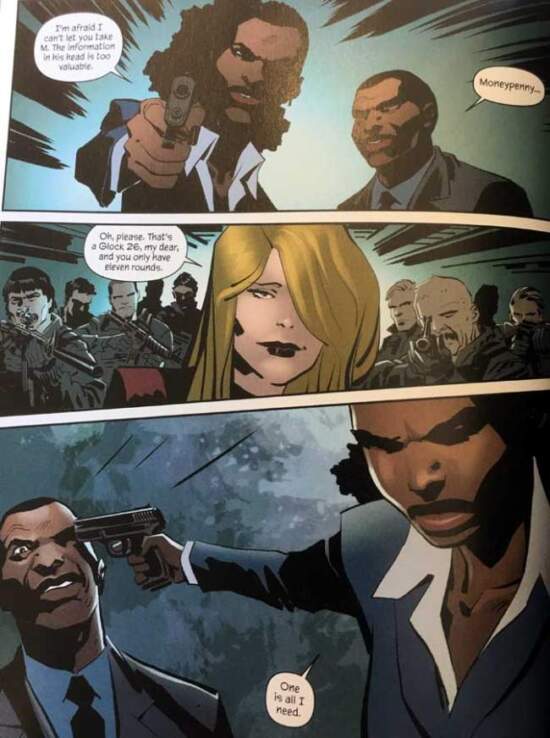 But the deft touches really make the comic worthwhile. Chief amongst these is the treatment of M’s secretary, Moneypenny. In the motion pictures, Moneypenny is usually the focus of Bond’s relentless flirtation (what would nowadays be properly construed as workplace harassment). In this title, Moneypenny flirts with Bond, but she is something more than that. Moneypenny’s major role is to protect the secrets in M’s head. In one cliffhanger scene, this includes threatening to put a bullet in M’s head.