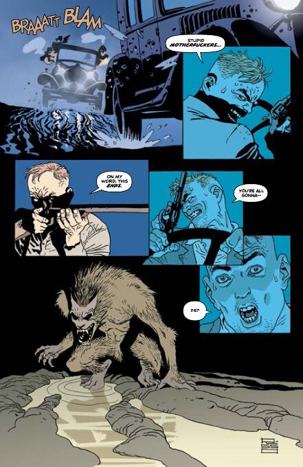 It is accurate to say that most of the violence is left to the imagination. The final chapter/reprinted issue, where Lou spends most of the issue as a werewolf, is a noteworthy exception, as it does show some rather extreme violence. It is interesting that Mr Azzarello adopted this approach without intending to give another nod to classic American horror films like the aforementioned The Wolf-Man. Extreme violence could not be shown in motion pictures due to censorship and lack of special effects technology, but having characters react to an off-camera sight of a mangled body, asking the audience to fill in the blanks with their imagination, would have been a highly appropriate evocation of the noir film theme.