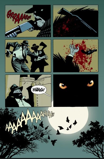 Hiram has an advantage here. While both the mob and the hillbillies that make up Hiram’s extended family are both capable of violence, Hiram also has a werewolf on his side. How many of these werewolves are assisting Hiram is as-yet unclear. For most of the trade, there appears to be only one: Hiram’s adopted son Enos. By the volume’s end, there is another one: Lou himself. It would be inaccurate to say Lou is now working for Hiram. Werewolves, as depicted in stories like these, are often little more than bestial killing machines, creatures that leave horribly-mangled bodies in their wake. The final reprinted issue shows the newly transformed Lou ripping the surviving gangsters apart before transforming back by book’s end. Who or what if anyone has control over the wolf-Lou is unclear as of yet.