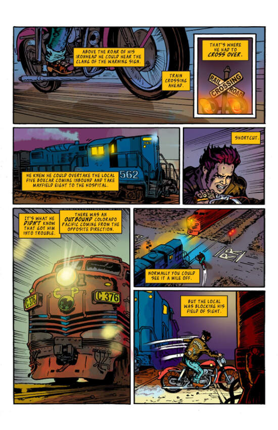 An interesting enough premise, with a nostalgic ’70s twist. But this synopsis vastly underrates the opening pages to the first issue. Set even earlier, in the 1950s, the description of the journey of a young man on his motorcycle, burning with enthusiasm to meet his newborn son, is some of the most poignant writing we have encountered. The narrator, Calvin, describes his father’s sprint towards a stretch of highway called the Mayfield Eight, with such finesse that it could be balanced on a wire. Not a word is misplaced. Even the chatter leading to the man’s happy departure from a diner is highly polished: “Hell of a world to bring a kid into,” says a nameless patron, reading about a new Soviet multi-kiloton hydrogen bombs. And then, “I was told there were three events in his short-lived life he was proud of…” It is refined writing.
