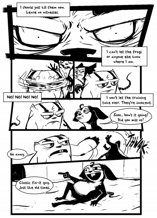 Referencing both “Lucifer” and “Henry the Cantankerous Hamster” in the single paragraph might seem eccentric at first blush. But, like Lucifer, the aloof and combative Henry is lord but not master of his subterranean place of exile. Henry has a superior intellect, vast resources in the form of his mechanical arsenal, and enhanced combat skills. Yet he is on the run. Joined by three mice who serve as the comedic foils to his curmudgeon dourness, a rat drops in from a surface drain. The rat seems to have been a victim to some other hamsters. There is a hint of some sort of “program”. And at the end, it seems likely that Henry will face his peers. Henry’s cantankerous demeanour, apparently, is fuelled by stress and fear.