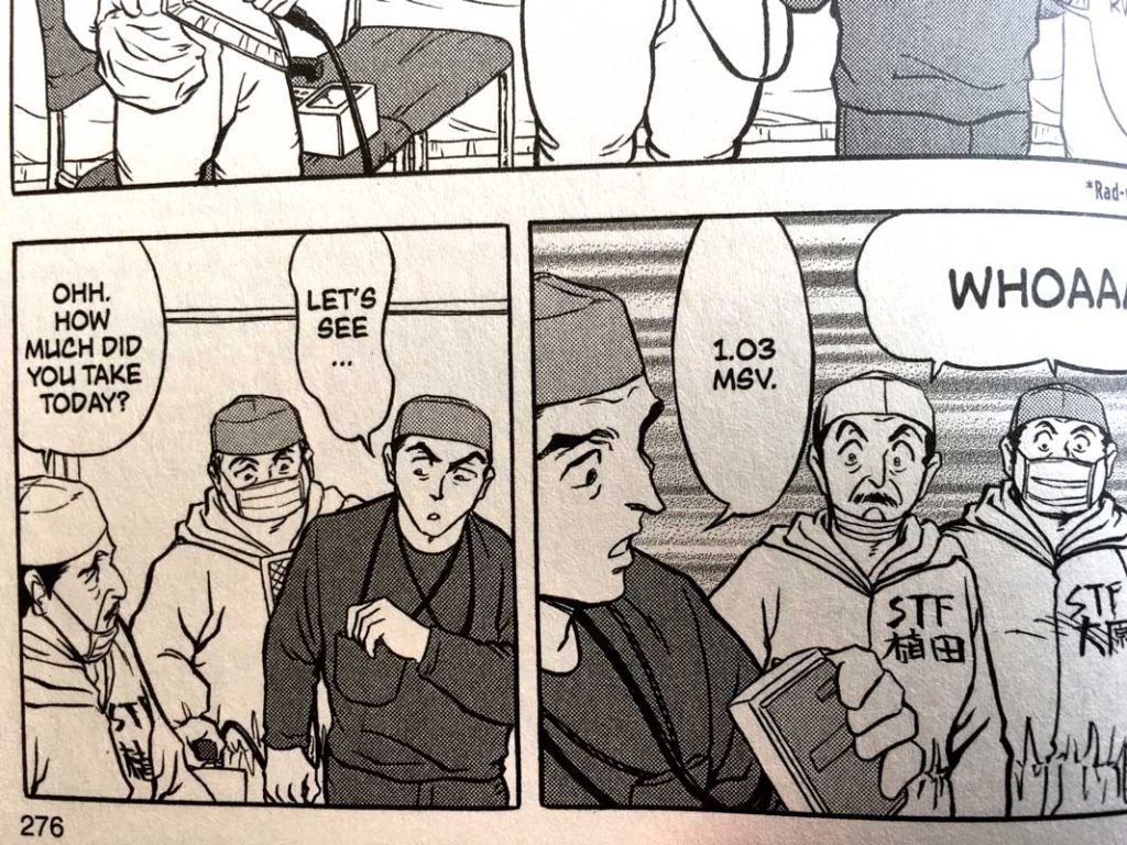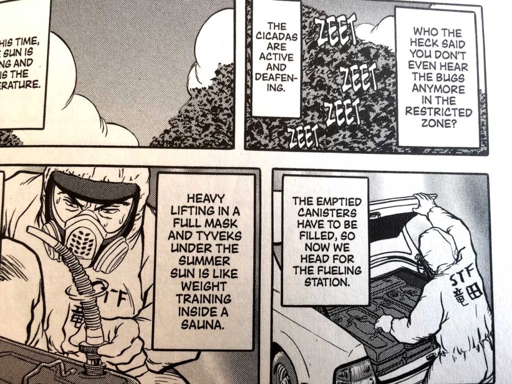 Much of this change is caused by the writer’s celebrity status which has arisen from the unexpected success of the manga. As he realises that he is an important part of the story – an insider’s perspective on the tedious reality of the clean-up – he becomes more aware of the significance of the manga in understanding the catastrophe, and how the manga is helping the people of Japan deal with it. The public interest in Mr Tatsuda’s work is the catalyst for coming to care about what he does. Mr Tatsuda’s motivation of money and adventure falls away. The manga in that sense shapes reality as much as it describes it. It is an unusual form of character development in that the manga itself affects its author.