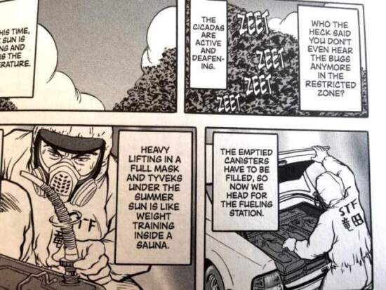 The fundamental problem with it is that it is boring. But the purpose of the text is to convey precisely that. Shorn of the media-driven hyperbole, the post-tsunami story of the Fukushima power station’s clean-up is tedious and devoid of any drama. The author, an ad hoc worker at Ichi-F, expressly set out to do precisely that. The deliberate intention of the anonymous author of this comic (“Tatsuda” is a pseudonym) is to counter the hysteria and misinformation concerning the decommissioning of the ruined nuclear power plant and the extent of radioactive pollution in the region. Causes for excitement within the text include the removal of stacked debris, the craftsmanship of welding cooling pipes, and the sudden innovation of using the curved exterior of a traffic cone to assist a remote control robot’s power cord get around a corner in an irradiated corridor. Save that it is set in a highly irradiated worksite, the subject matter would be dreary and mundane.