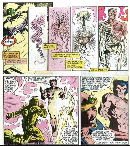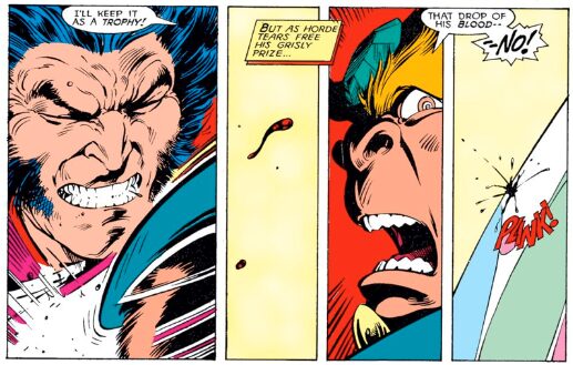 At this point, the psychoanalysis in the story ends. Wolverine is the sole survivor of the X-Men, and no match for the story’s antagonist. Horde leisurely impales Wolverine on a spear, and then mocks Wolverine as he tries to crawl and reach for the Crystal. It is out of arms’ length, and it seems that the X-Men have entirely failed. But then, Horde makes an arrogant mistake. He decides to tear Wolverine’s heart from his chest as a trophy. This causes a drop of Wolverine’s blood to spill onto the Crystal.
