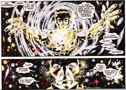 Within the single issue, Wolverine has ascended from heart-broken drunk to God. But Wolverine’s sense of his own inherent failings, manifest at the beginning of the issue, compel him to realise that he is not fit to be ruler of the cosmos. Wolverine then destroys the Crystal of Ultimate Vision in order to prevent anyone else from using it and succumbing to its power. The story forms a complete circle.