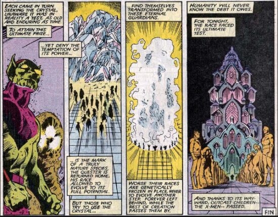 As stated above, this story represents the apex of Mr Claremont’s skills. In addition to the usual superheroic world-saving grandstanding, the story is imbued with repeated psychoanalysis of each of the players, and ends with an enormous character twist. Remarkably, the story is entirely self-contained. Each of the characters is nonetheless the subject of scrutiny in respect of their personalities and drivers. The examination of each character is contained in a psychological challenge, which almost all of them fail and, dramatically, die. Each of these challenges is captured in a small vignette which in turn is woven into the greater plot, where the parts jigsaw to form the whole. Observed from the perspective of structure alone, the story is a remarkable achievement, and thirty years on, is worth commemorating.