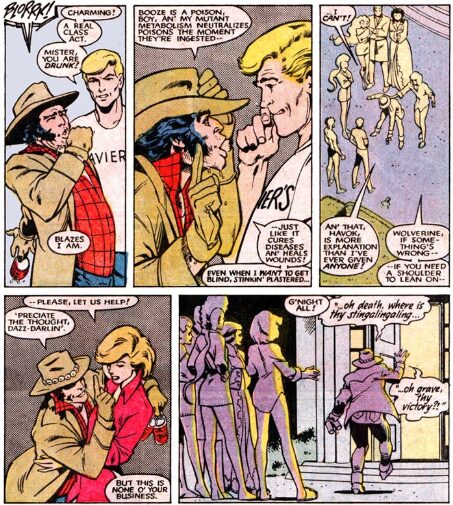 The mutant superheroes reside in a mansion, and the story starts with the Canadian mutant known as Wolverine staggering home drunk late one evening.