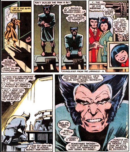 As it evolves, the drinking binge is triggered by deep pain. The day marks the anniversary of what would have been his marriage. The inherent dichotomy of the character is laid out. Wolverine is a man who wishes to better himself. The character is a mutant berserker, armed with razor-sharp claws, his skeleton equally unbreakable, and his flesh capable of regenerating from the most grievous injury. Wolverine can inherently get whatever he wants through force. But he chooses instead to internally best his animalistic nature: