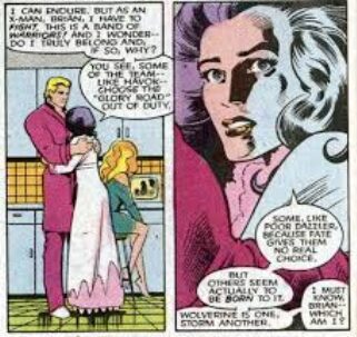 Elsewhere in the mansion, the mutant called Psylocke contemplates her own purpose. Why on earth is she on a team of mutant superheroes? As a telepath, she has no overt offensive combat skills. She does not understand herself or her role, and has a meaningful discussion about the topic with her brother, a superhero called Captain Britain: