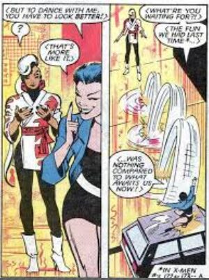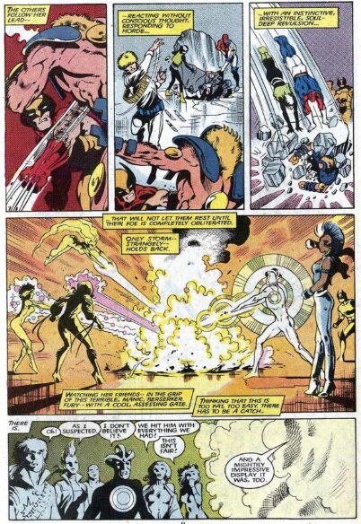 Duty drags Storm back into the Citadel, but she retains her “party clothes” – a sign that the offer remains open, and that her heart is not sealed to the idea of endless crazy fun in Japan. This is a new insight into the character, not revealed previously within the title. Storm became leader of the X-Men after besting the previous leader, a mutant named Cyclops, in a friendly duel (Uncanny X-Men #201, November 1986). But leading the X-Men is plainly not her preference. Storm is the leader because she is best for the role, and not, as the vignette makes plain, because she desires the role. On the contrary, Storm desires the antithesis of responsibility. She would prefer to run away.