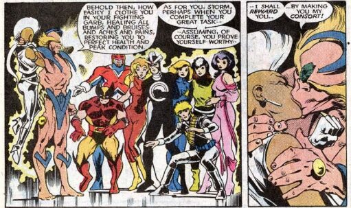 Psylocke’s telepathy confirms that Horde has “laid waste to thousands of worlds” and that his threat to destroy the Earth if the X-Men do not assist him is not an idle one. Horde does not mind engaging in cross-species sexual harassment as he sets the team on their mission: