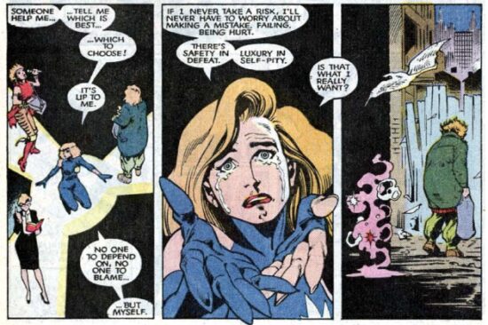It is a terrible and poignant insight into the character’s basement sense of worth. Being a celebrity musician does not stem Dazzler’s inherent self-doubts. The character is depicted as washed up into the X-Men, lost and joining the team through an absence of knowing what else to do or where else to be. A sense of belonging is the only motivation the character has in being a superhero. Absent that, Dazzler thinks she has no purpose at all. Nowhere else in mainstream superhero comics had a character been portrayed as a functionally depressed, until Frank Miller’s All-Star Batman (2005-2008, DC Comics).