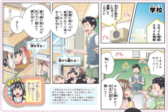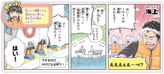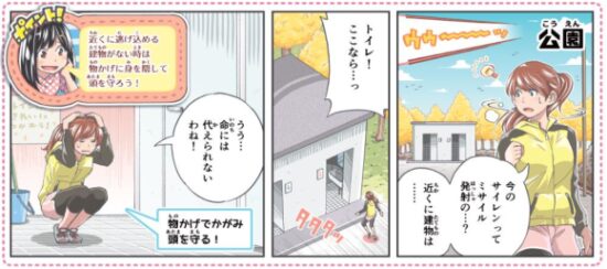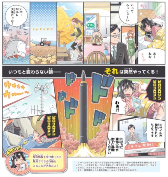 The Hokkaido Prefectural Government, in response to the threat of a North Korean missile strike, has conducted evacuation drills for Hokkaido residents. The Japan Times reports that the government has this month (October 2017) also issued a four page A-4 manga to assist Hokkaido residents on how to respond to a missile launch.