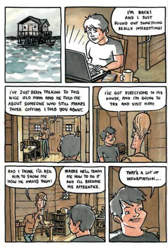 There is nothing so blunt as a Neil Gaiman-esque ferryman here, despite the obvious symbolism of a coffin-shaped boat carrying the dead across the water. We glimpse archetypal rebirth through fire and water, but it is almost imperceptible. Mr Potts graduated from Hull School of Design (graphic design and animation) in 1997. Hull has a long-tradition of maritime trade and lifestyle and perhaps Mr Potts has drawn some inspiration from his surrounds during his studies. But what is clear is that Mr Potts learned at some stage to craft a story with such finesse, with such a slow creep, as to cause a reader to puzzle, re-consider, research, ponder, over and over again.
