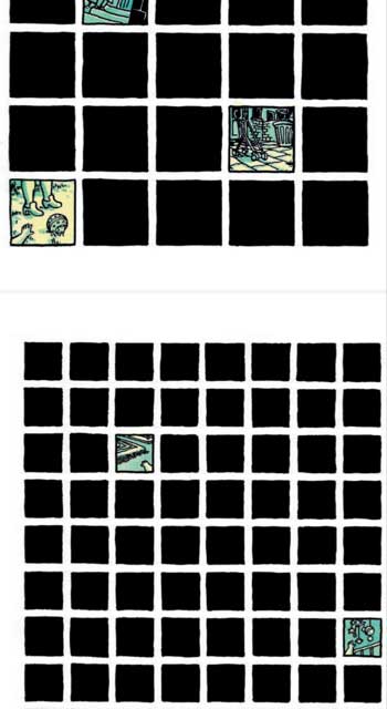 But is that all there is to it? On the first page, a young boy on a tour boat heading up river sees Rita and Carl on the stilted house, and waves. But the house is described by the tour guide as empty, and apparently no one else on the vessel see Rita and Carl. The river on which the stilted house sits is dead, and occupied only by a dead fish which has nonetheless bitten the hook. Wherever Carl goes, people stare at him. The book Carl has found is old and bound in leather, hidden behind a cupboard, filled with secrets. The dinghy floated away from the house, but Carl is utterly sure that he fastened it tightly – and so how and why did it become loose? The tide rises far too fast. The storm approaches and belts down rain, but the river sparkles and twinkles, untroubled in the serene moonlight, carrying Carl away. And trapped within the coffin, Carl sees his own funeral, and then Rita as a ribbon of light, an angel, and then his own life winding backwards, his memories as diminishing and multiplying squares.