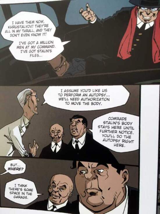 The first of these that we are introduced to is Beria, the head of the secret police. The first image we have of Beria is his rape of a woman over his office desk. This nameless woman is given no dialogue and her eyes are wide and staring forward. Silence and the passage of time in the sexual assault are her only means of survival at the hands of this notorious and evil figure from Russian history. Beria is entirely beyond reproach, for the police are his accomplices and possibly his procurers. After being told of Stalin’s heart attack, we read Mr Nury’s most chilling exchange in the entire comic: