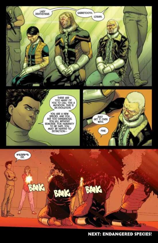 The biggest surprise of this issue is contained in the last few pages. It shows the Orphans of X summarily executing three captured individuals, the characters Lady Deathstrike, Sabretooth, and Old Man Logan himself. These are three important characters to the Wolverine franchise. The graphic depiction of the characters each being shot in the head leave no questions as to their fate. Witnessing three important characters killed with very little fanfare is intriguing. We are genuinely invested in how things will play out. (One possibility is that the Orphans of X did not use the Muramasa bullets, which means what we saw is not an execution but instead a form of torture: Wolverine has in the past recovered from gunshot wounds to the head.)