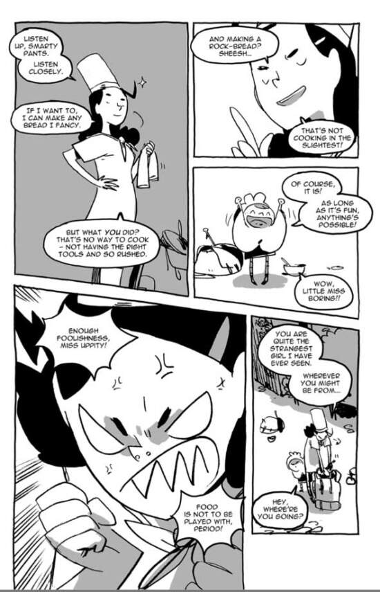 The two encounter each other when Uma leaves her home town on a quest for salt. But there is no salt to be found nearby, and so Uma resolves to travel the great distance to the capital to procure it. En route she meets Ami, whose cook book had been stolen by an enormous pigeon in a tower to Ami’s open air kitchen. Uma uses her terrible cooking skills to build a hardened bridge to the pigeon’s tower, and recovers the book at personal peril. (This is somehow buried in the story at this point a small reminder of the magic of cooking: that mixing things together can lead to the unexpected.)