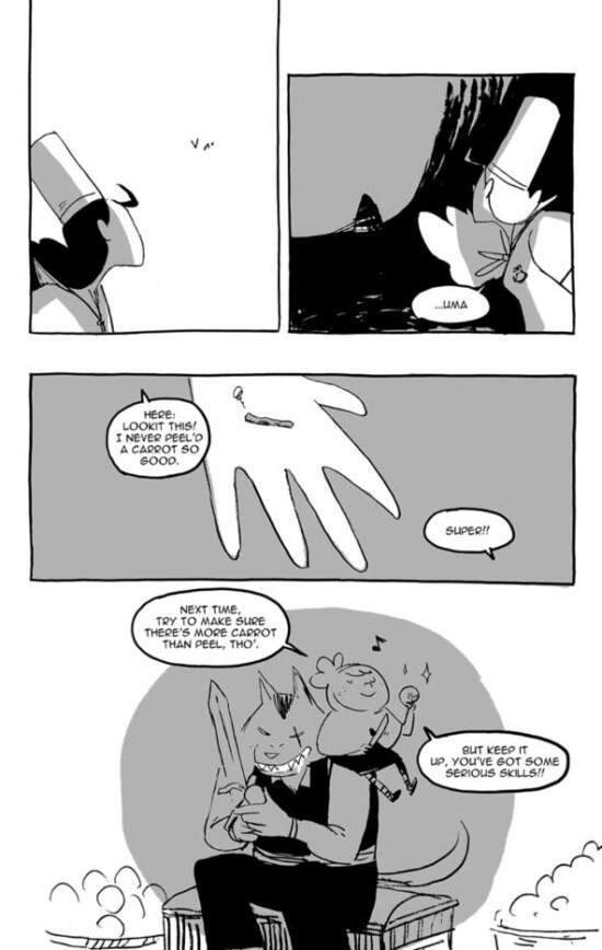 In the second issue, the two are trapped by two argumentative white wolves, who cannot agree whether they are “The Bandits of Destruction” or “The Morbid Bandits”. One of them is dreadfully constipated. Uma and Ami offer to make them a meal in exchange for release. Ami kisses mushrooms when she has success in cave foraging for ingredients, but also discovers in a cavern the skulls of the wolves’ previous victims – they have a penchant for “hoooman stew.” How the two hapless and hopeless heroines will escape the Bandits remains to be seen, but we guess it involves toilet humour to do with the blocked-up wolf.