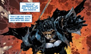 In contrast, the monologues in Batman: The Drowned is compelling and weighty. Here, the gender-switched Batman (who we shall call The Drowned to avoid confusion) engages in brutality and self-harm to win a war against Atlantis. The promise of violence inherent in superhero comics is thereby fulfilled.