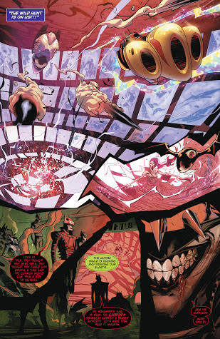 Dark Knights: The Wild Hunt #1 does this in an oblique way. It is a mad adventure, entirely reminiscent of the madcap and psychedelic work of Scottish writer Grant Morrison. (Mr Morrison wrote the series Seven Soldiers of Victory for DC Comics from 2005-2006, which also featured a hunt of superheroes, but by sinister magical creatures which ritually raze the Earth every few thousand years).