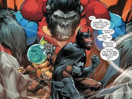 Some of the story is equally baffling. The conclusion of the issue sees the return of the themes from the 1999 crossover event, JLApe: Gorilla Warfare!, a weird storyline involving DC Comics’ superheroes as monkeys, and it appears to us to have been mucked out of the very bottom of Mr Morrison’s kaleidoscopic brain.