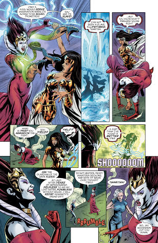 To have this character and her story plonked into a battle between a wicked fairy (the Queen of Fables, a forgettable Justice League villain from the mid-2000s) and lowbrow superhero characters such as Lobo and the reformed villain Killer Frost seems to us to be akin to using a baroque marble fountain as a urinal. It is also interesting that Promethea is not depicted in her scarlet Whore of Babylon attire. Perhaps DC Comics’ editorial team formed the view that this would offend the sensibilities of the readership.