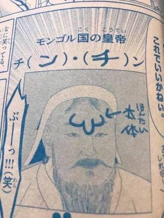 “The insulting image was a cell from the manga Yarisugi!!! Itazura-kun (Too Far!!! Prankster), a gag manga aimed at kids. In it, the iconic portrait of Genghis Khan is drawn with a penis on its forehead and a pun is made playing on the similarity of “Chinggis” [an alternative spelling of “Genghis] with chin chin, which means “penis” in Japanese.”