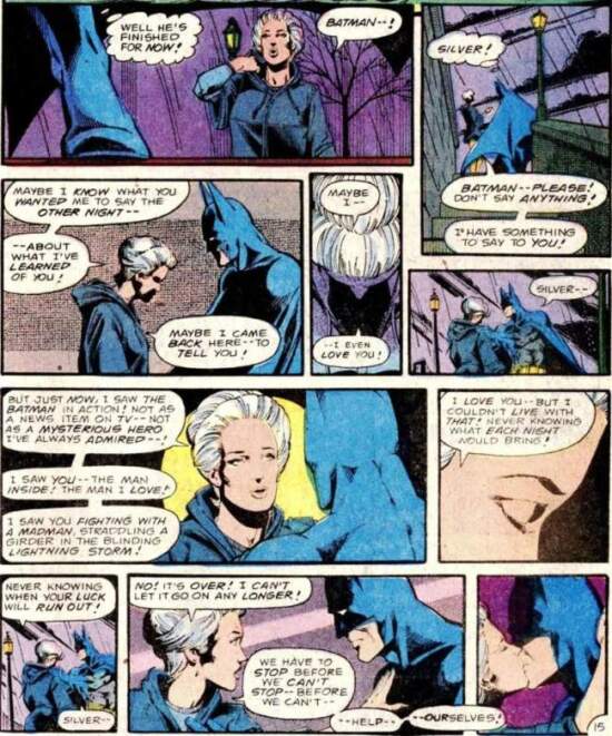 What are the scenarios if Batman and Catwoman cannot live comfortable existences without masks and violence? First, Batman is stood up at the altar by his wife to be. Batman has been jilted before. Detective Comics #476 depicts Batman dumped by a socialite named Silver St Cloud: