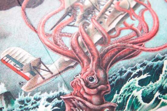 The comic is a gatefold, describing the beasts which confront and devour men at sea. There are no sequential panels which tell a story. Instead, we read a text-less series of drawings whereby seagoing vessels of various eras battle enormous, exotic kaiju monsters. These images are beautifully rendered: