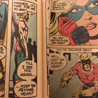 Hawkman, Liberty Belle, and Johnny Quick all “keep ‘em flying, hear?” in various issues of All-Star Squadron, 1981.