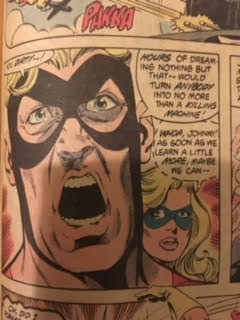 As the Justice Society members are trained to brutally kill, Johnny Quick is repulsed by their bloodthirsty brainwashing. But killing is what soldiers do, irrespective of whether they are in the good war or not. Indeed, in All-Star Squadron #3, the Justice Society of America is disbanded so that each of the heroes can join the US Army (save for Johnny Thunder, who joins the navy). The story in All-Star Squadron #19-20 culminates in Green Lantern using his enormously powerful magic ring to destroy a dream version of Tokyo, in a clear parallel to the atomic bombings of Hiroshima and Nagasaki (see the image at the beginning of this review). As a consequence, Green Lantern is reduced to tears, a broken man.