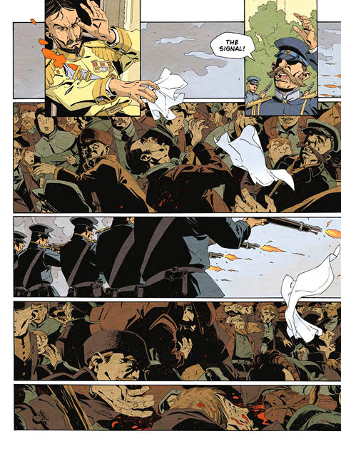 An imperial absence of human empathy is well illustrated within this comic. The repeated massacres by the nonchalant Tsar of peaceful men, women, children, and priests carrying the Russian Orthodox cross is repeatedly depicted in this comic in horrifying detail.